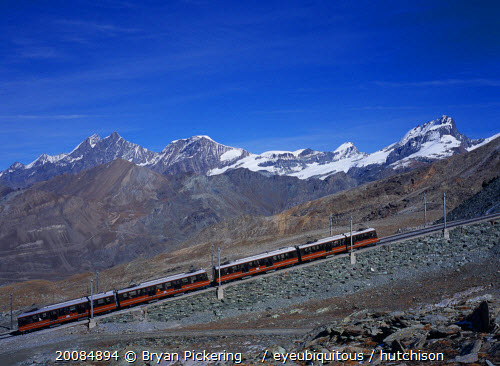 Gornegrat Railway with train traveling past snow capped mountains left to right Oberrothorn 3414metres 11180ft and Fluehorn 3317metres 10863ft European Schweiz Suisse Svizzera Swiss Western Europe Wallis Polynesia Scenic Travelling Valais Many Islands Pacific Islands Polynesian
