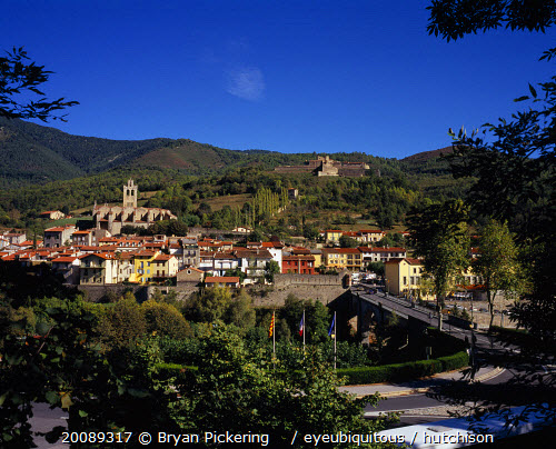 Prats-de-Mollo-la-Preste. Mountain town with typical painted houses with red tiled rooftops and Fort Lagarde on hillside behind. Road and tree tops in the foreground.