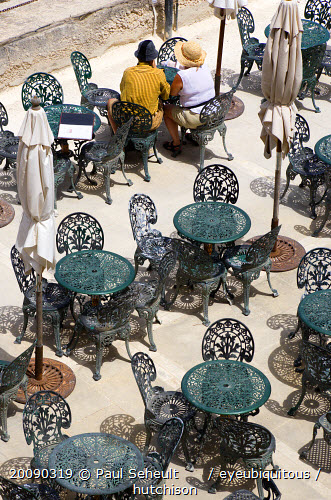 Couple of people sitting at a table amongst other wrought iron tables and chairs in a cafe below the Upper Barrakka Gardens overlooking Valletta Harbour