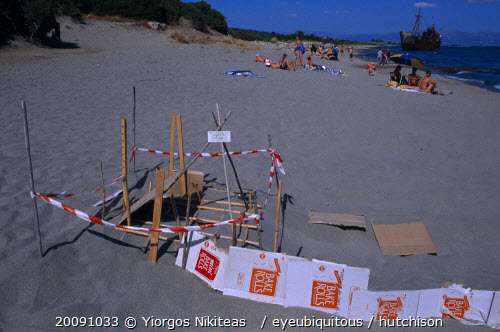 Sea Turtle protection consisting of wood and cardboard forming a cordon around an area on sandy beach near sunbathersEuropean Beaches Ecology Ellada Entorno Environmental Environnement Greek Green Issues Resort Seaside Shore Southern Europe Tourism Tourists Travel