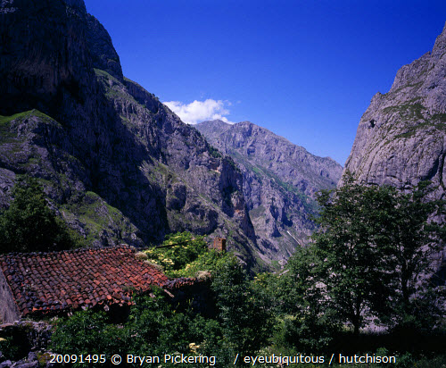 View north down Arroyo del Tejo Valley from Bulnes El Castillo with steep sided eroded limestone cliffs and red tiled roof of ruined barn in foreground.