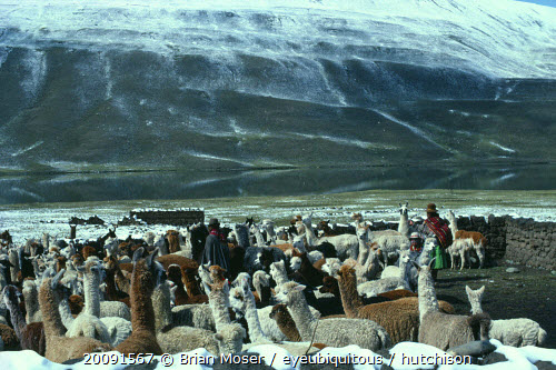 Family of llama herders next to river with green snow covered mountains behind. Near Peru.American Bolivian Farming Agraian Agricultural Growing Husbandry Land Producing Raising Hispanic Latin America Latino Peruvian South America