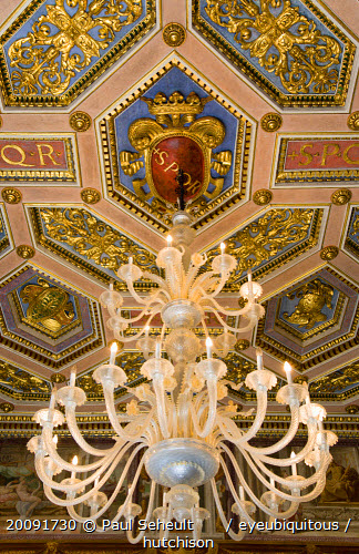Capitoline Museum Palazzo Dei Conservatore chandelier hanging from the ceiling in the Palace with SPQR visible on the ornately decorated ceilingEuropean Italia Italian Roma Southern Europe History Learning Lessons Teaching
