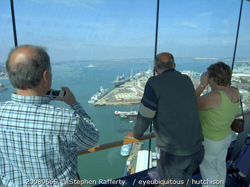 Gunwharf Quay, The Spinnaker Tower. Interior with visitors looking out of glass windows on the top observation deck providing a 320ยก view of the city of Portsmouth the Langstone and Portsmouth harbours and a viewing distance of 37 kilometres 23 miles