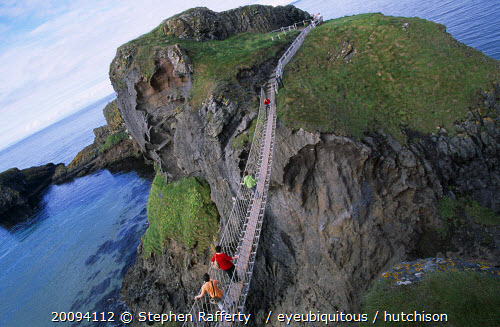 Carrick-a-Rede Rope Bridge. Vistors walking over rope bridge linking a rocky island to cliffs. Originally used by local Salmon fishermen Eire European Holidaymakers Irish Northern Europe Republic Scenic Tourism Tourist