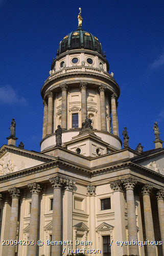 Franzosischer Dom in the Gendarmenmarkt built by the Huguenot community 1701-1705. Colonnaded exterior with domed tower and statues on roof. French CathedralCalvinistEighteenth Century 18th c. Deutschland European Religion Religious Western Europe History