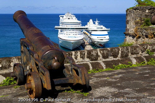 An old canon pointing out to sea at Fort George with two cruise ships the Caribbean Princess and the Aida Aura moored below at the cruise ship terminal in the capital city of St Georges with passengers walking on the jetty between the two linersCaribbean Grenadian Greneda West Indies Grenada 2 Holidaymakers Tourism Tourist