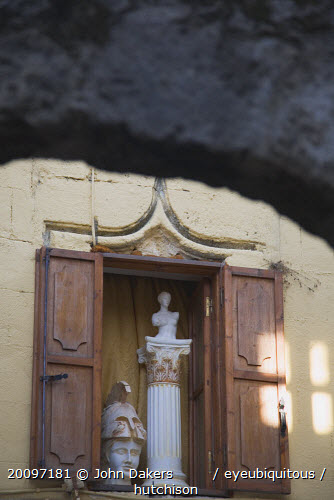 Detail of window in wall of building with open wooden shutters displaying statutary; head of a soldier and torso of female figure on column.AegeancoastcoastalFormer Ottoman territoryearlySummer seasonlocation of Guns of Navaronepackageholidaytrip DestinationDestinations ElladaEuropeanGreekSouthern EuropeUNESCO World Heritage SitebuildinghistoricDestination Destinations Rodos