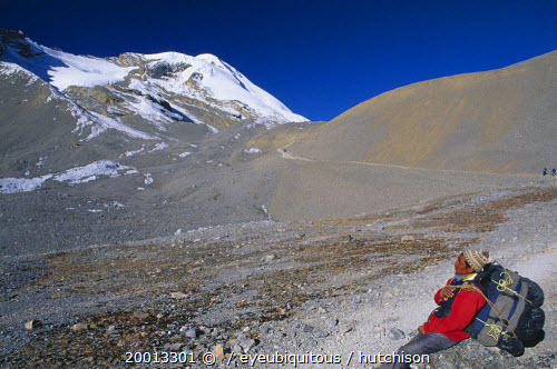 Porter carrying large back pack resting on the approach to Thorung La pass.