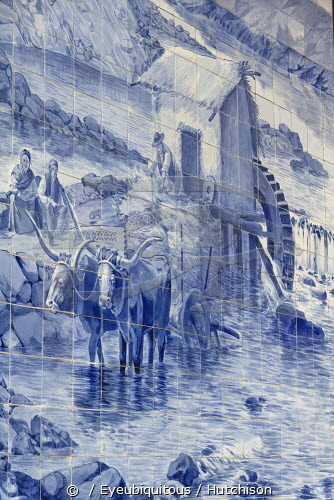 Portugal, Porto, Sao Bento railway station built in the early years of the 20th century with detail of one of the large panels of around twenty thousand azulejo tiles designed and painted by Jorge Colaco here showing work at a rural watermill.