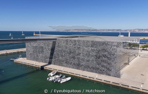 France, Provence, Marseille, Museum of European and Mediterranean Civilisations or MUCEM, a cube of 15,000 square metres or 160,000 sq ft surrounded by a latticework shell of fibre-reinforced concrete, it was designed by the architects Rudy Ricciotti and Roland Carta and inaugurated in 2013.