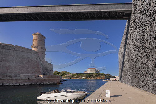 France, Provence, Marseille, Museum of European and Mediterranean Civilisations or MUCEM, a cube of 15,000 square metres or 160,000 sq ft surrounded by a latticework shell of fibre-reinforced concrete seen here with the 17th century Tour du Fanal lighthouse under the footbridge that connects it to Fort Saint Jean.