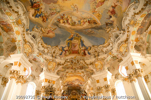Baroque church interior view of ornamentation and frescoes painted on celling above main altarReligion Architecture Churches RococoUNESCO World Heritage Site Bayern Deutschland European Religious Western Europe