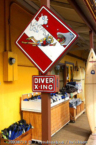 Surf and dive shop sign with cartoon diver feeding a shark