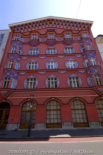 Angled view looking up at the Art Nouveau facade of the Cooperative Bank designed by Ivan Vurnik and decorated by his wife Helena Vurnik in 1922