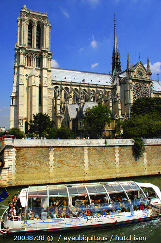 Glass topped tourist boat passing the Notre Dame Cathedral