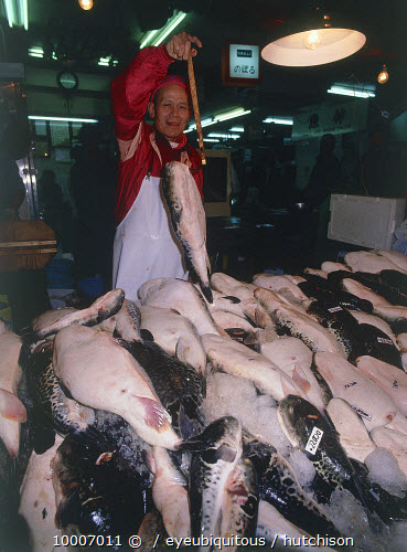 Fugu Globe fish being held up by man in the Koromon Ichiba market