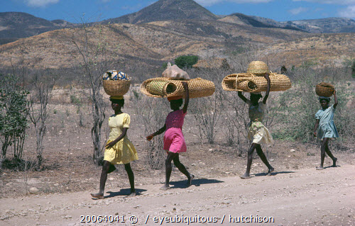 Line of girls carrying bags and baskets on their heads.