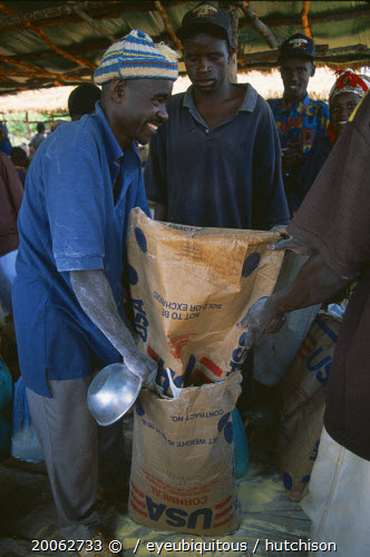 Mkugwa Refugee Camp. Distribution of food aid supplying cornmeal from the United States of America.The Congo Burundi and Rwanda Zaire