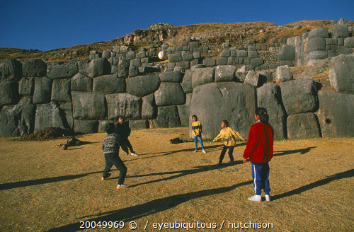 Local children playing volleyball in front of walls of Inca fort on Sunday. Cuzco