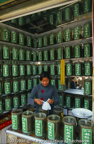 Young woman serving a customer partly seen reflected in mirrored wall behind her in a shop selling Chinese medicines stored in jars on surrounding shelves.