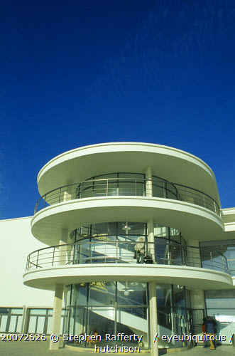 De La Warr Pavilion. Exterior view of the staircase section. Art Deco building built by the Earl Of De La Warr in 1935 Designed by Erich Mendelsohn and Serge Chermayeff Recently restored 2005 Grade One listed building European Great Britain Northern Europe UK British Isles History Pavilion Single unitary United Kingdom One individual Solo Lone Solitary Pavillion