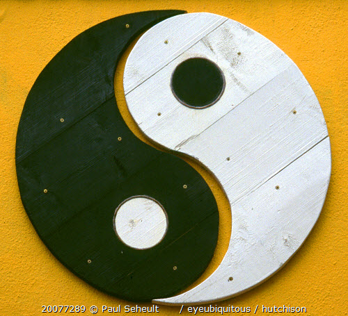 Yin and Yang symbol painted onto a wall. Yin Yang originates in ancient Chinese philosophy and metaphysics which describes two primal opposing but complementary forces found in all things in the universe. Yin the darker element is passive dark feminine downward-seeking and corresponds to the night; yang the brighter element is active light masculine upward-seeking and corresponds to the day; yin is often symbolized by water while yang is symbolized by fireEire Republic Ying