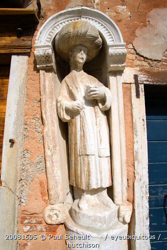 One of the three stone statues of Moors which gave the name to Campo dei Mori. This turbanned one is beside the front door of Tintorettos house at 3399 Fondamente dei Mori in the Cannaregio district