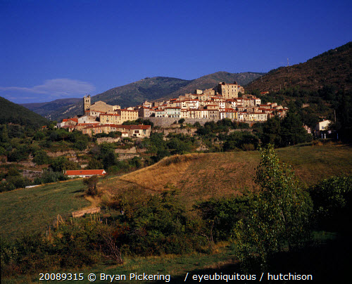 Mosset. View towards hillside village from the east with narrow houses with painted window shutters and red tiled rooftops. Backdrop of rocky hills scatteres with trees.