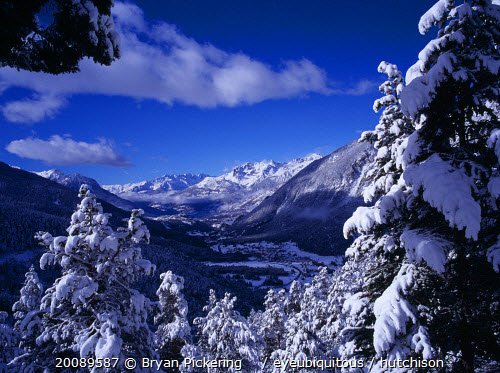 View west from Col de Montgenevre over snow covered trees towards Ecrin National Peak and mountain peaks. Part framed by snow covered branches in foreground.
