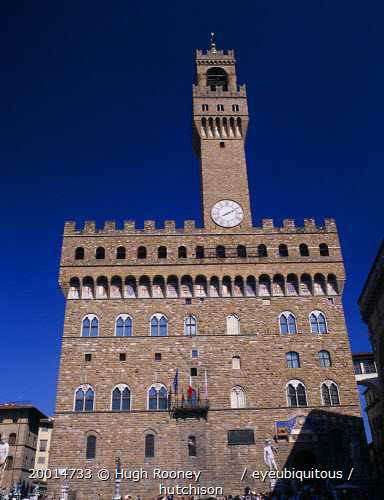 Palazzo Vecchio. Facade of medieval palace completed in 1322 and used as the town hall. Crenellated roof and clock tower with statues outside entrance including copy of Michelangelos David.