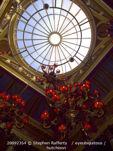 Interior of the Cafe Vaudeville bar and restaurant in Arthur Street. Detail of skylight and chandeliers building used to be a Bank.BŽal Feirste Eire European Irish Northern Europe Republic Ireland Poblacht na hƒireann Bistro Inn Tavern