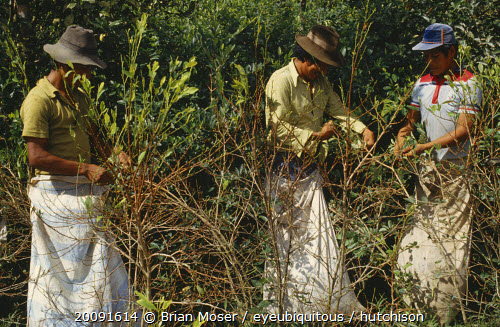 Men picking coca leaves. Traditional commercial coca growing area mainly for cocaineAmerican Bolivian Classic Classical Farming Agraian Agricultural Growing Husbandry Land Producing Raising Hispanic Historical Latin America Latino Male Man Guy Older South America