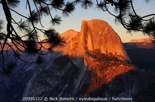 Half Dome at sunset with pine branch silhouettewide angle landscape North America Scenic United States of America American National Park Northern Solid Outline Shade Silhouetted Sundown Atmospheric The Golden State wide angle landscape North America Scenic United States of America American National Park Northern Solid Outline Shade Silhouetted Sundown Atmospheric The Golden State