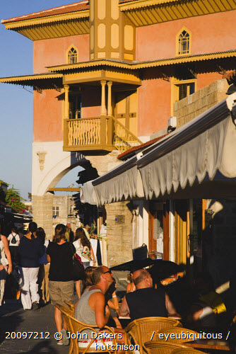 Exterior of restored Ottoman era Mosque on Odos Sokratous Street the main tourist shopping area in Rhodes Old Town with people seated at outside tables of cafe in foreground.AegeanGreekByzantineRodilocation for Guns of Navaronecoast coastalsun sunshine sunny holidayresortdestinationUNESCO World Heritage SiteHistoric Bar Bistro Destination Destinations Ellada European History Historic Holidaymakers Religious Restaurant Rodos Sightseeing Southern Europe Tourism Tourists