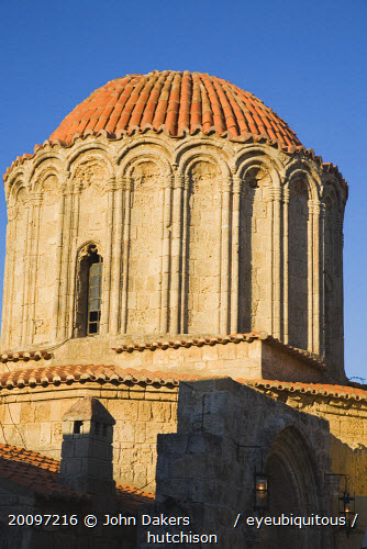 Greek Orthodox Church in the Old Town with red tiled roof dome.AegeanGreekByzantineRodilocation for Guns of Navaronecoast coastalsun sunshine sunny holidayresortdestinationUNESCO World Heritage SiteMedieval HistoricBuildingDestination Destinations Ellada European History Historic Religion Religious Rodos Southern Europe