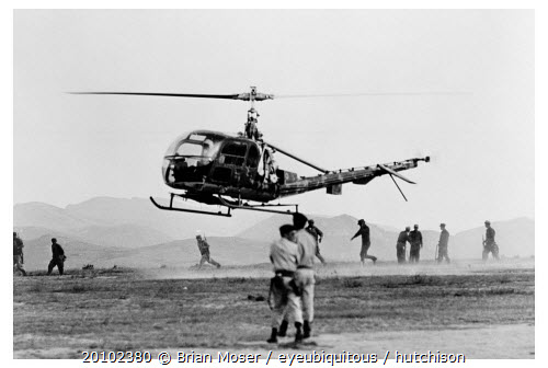 Bolivia, Santa Cruz, Vallegrande, Helicopter carrying the body of Che Guervara on the far helicopter skid approaching Vallegrande airstrip. Monday 09 October 1967