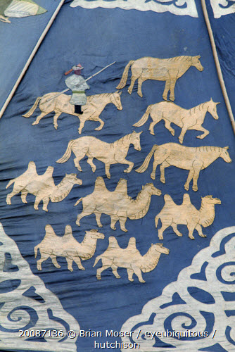 Detail of ancient silk tapestry depicting man on horseback herding camels and horses in Ulan Bator Museum..Ulaanbaatar East Asia Asian Baator Equestrian Male Men Guy Mongol Uls Mongolian Ulaan